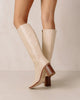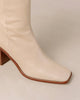 The East Off White Knee High Boots, crafted from premium off-white leather, feature a squared toe and a side zipper for enhanced comfort. With a 7.5 cm block heel, they provide stability and elegance. Designed in Barcelona and made in Spain, these boots epitomize sustainable fashion through their artisanal craftsmanship.