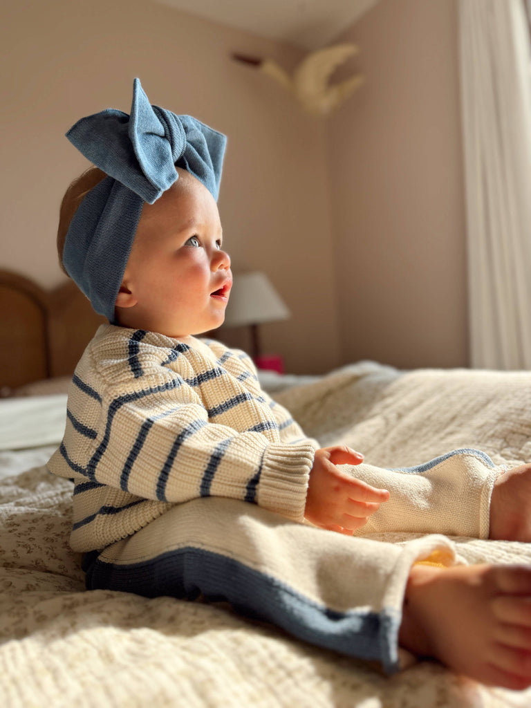 Sweater weather? Oh, it’s officially here! 🍂 This chunky knit sweater is the cozy essential your baby needs. With a ribbed collar, cuffs, and hem, it’s comfy, casual, and just a bit oversized for that effortlessly cute look. Plus, those denim blue stripes? Extra charm, no effort needed. Crafted from 100% organic cotton, it’s breathable but warm—perfect for indoor snuggles or outdoor adventures.🍁 100% Organic Cotton What's included: * (1) Sweater Care Instructions: Cold gentle wash with like colors. Lay flat to dry.