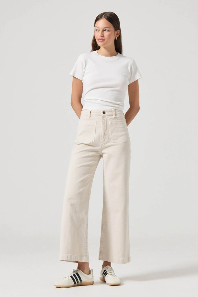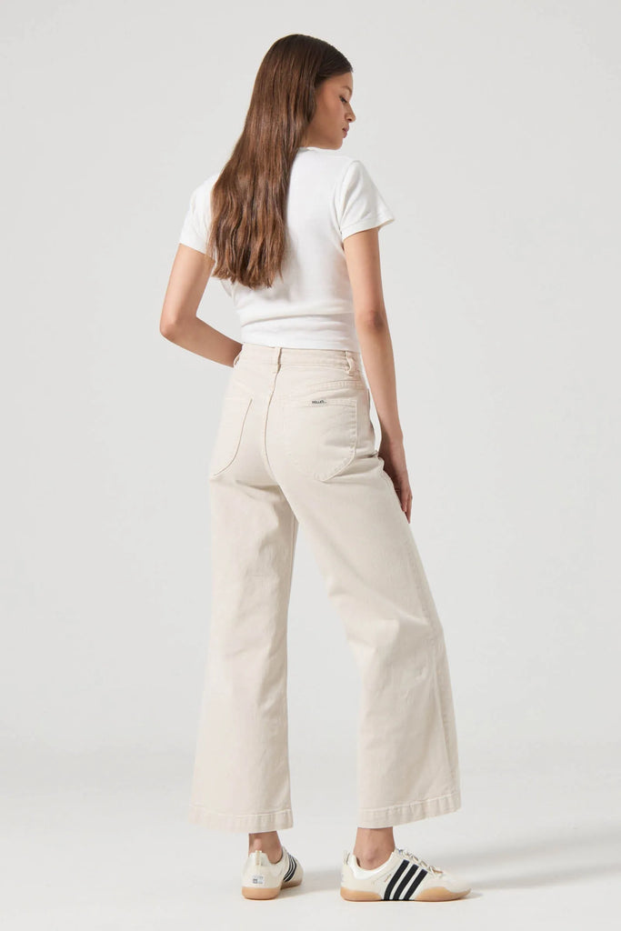 Introducing Sailor - Golden Salt, the must-have super high-rise, wide leg jean made with comfort denim. This versatile denim fits true to size for the perfect fit every time. Elevate your style with these flattering and comfortable jeans.