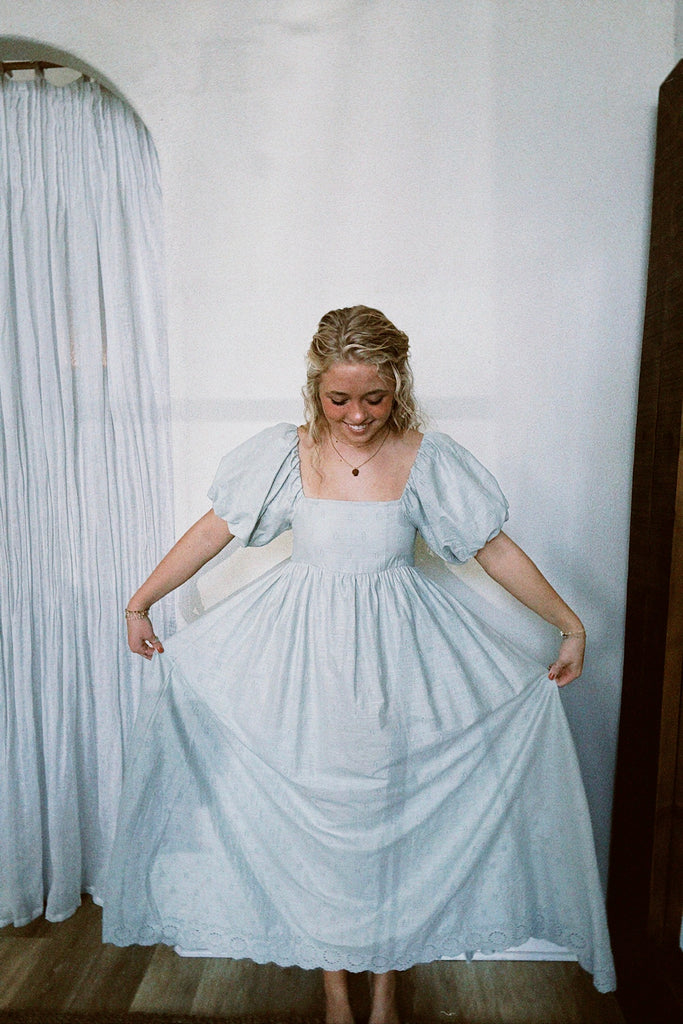 This maxi dress features scallop trim detailing on the hem and puff sleeves with elastic openings, enhancing both style and comfort. Made from 100% cotton, it offers breathability and ease of care, supporting machine wash and low tumble dry. The lining provides additional structure, ensuring a flattering silhouette.
