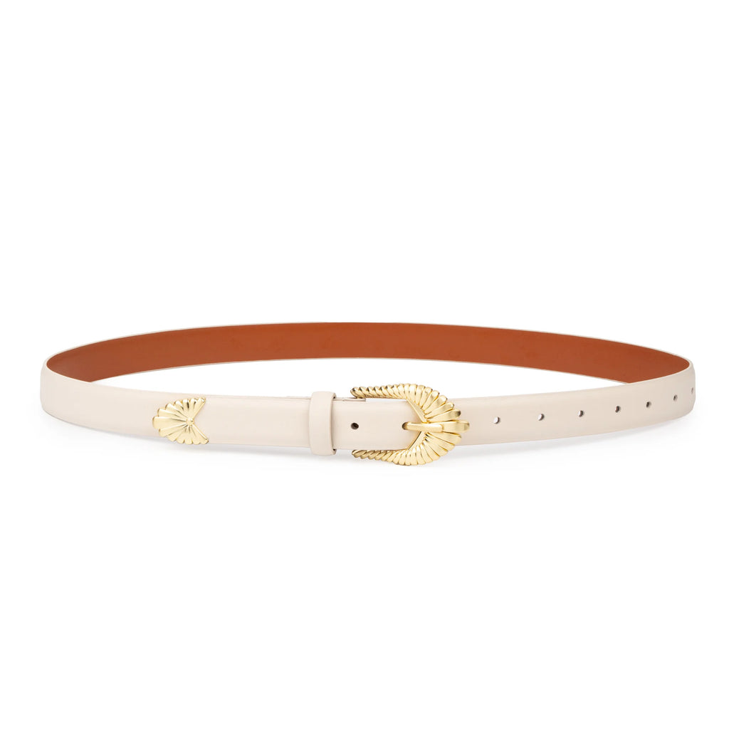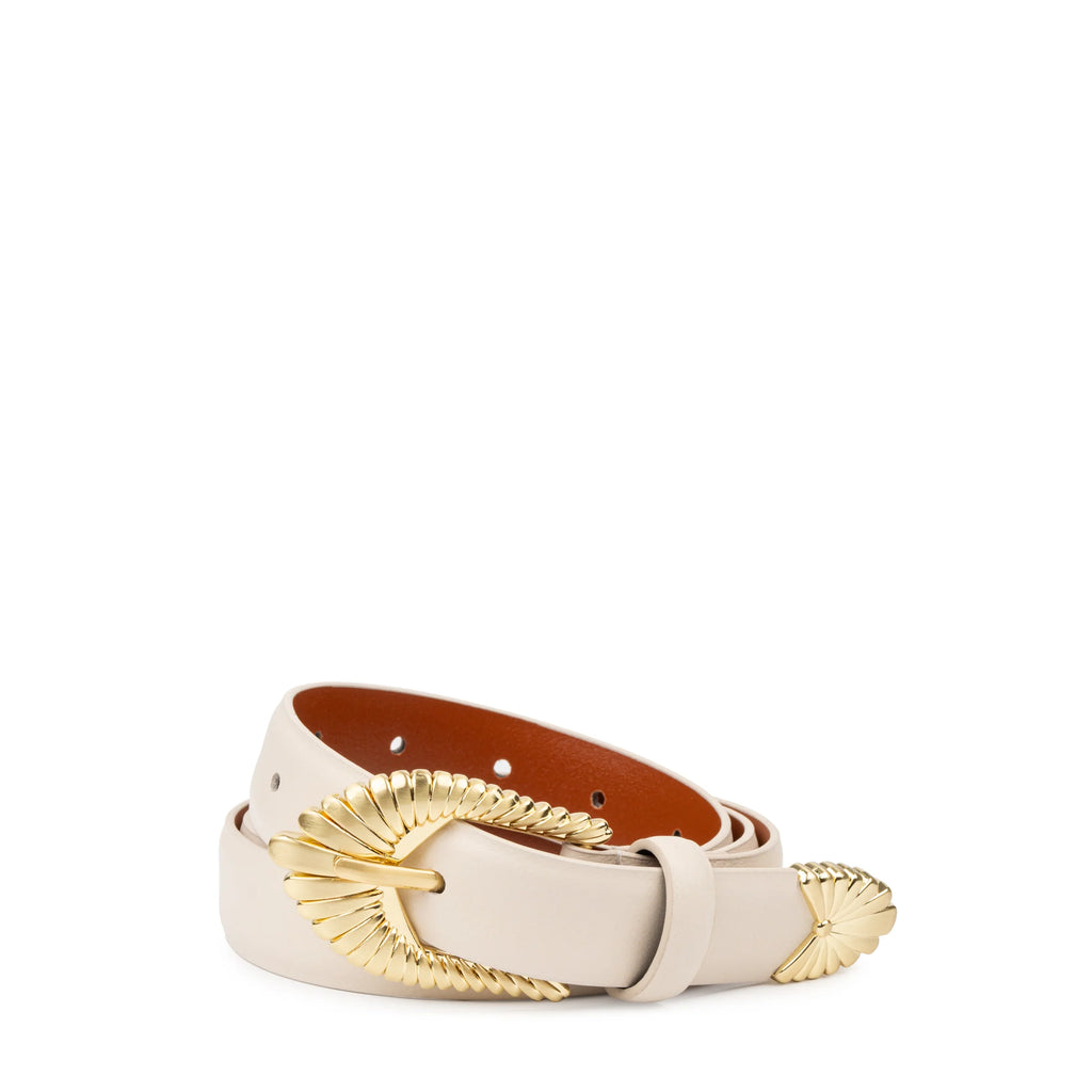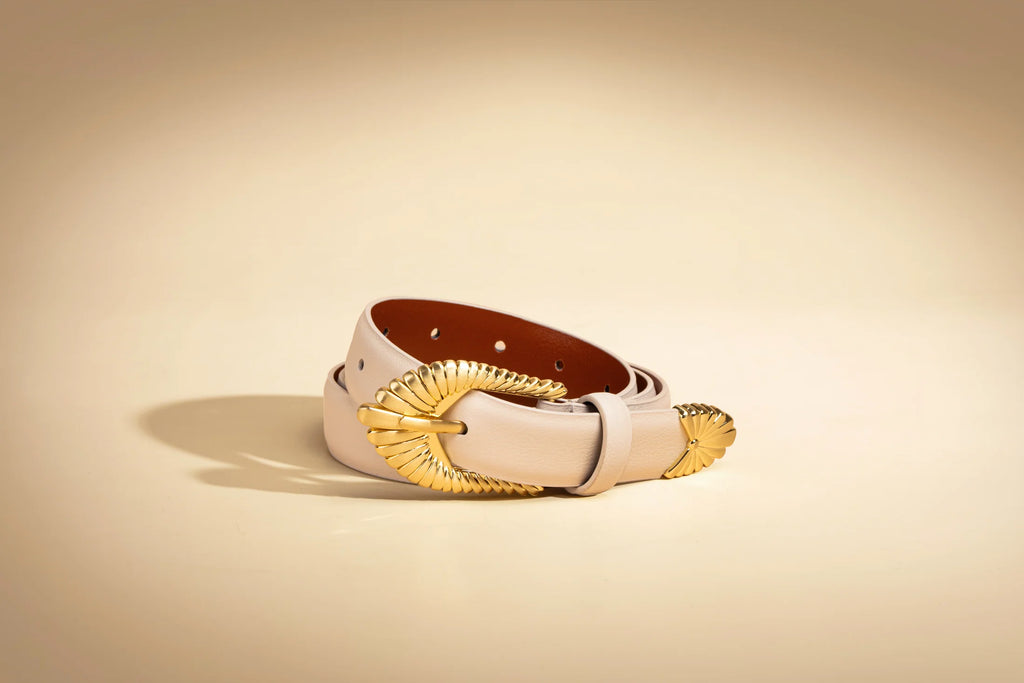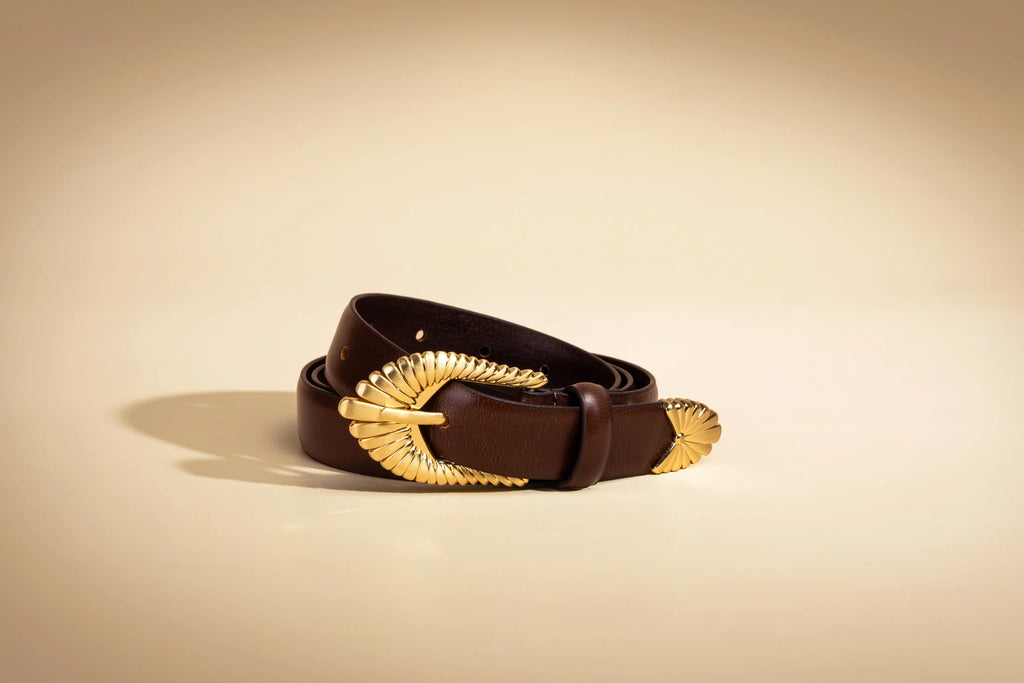 Elevate your style with the Zolna Belt from SANCIA. Inspired by blooming petals, this unique belt adds a statement touch to any outfit. The brushed gold buckle and custom design ensure a timeless piece that can be worn season after season. Express your creativity and cherish this belt for years to come. Both Ecru and Cocoa colors are available.