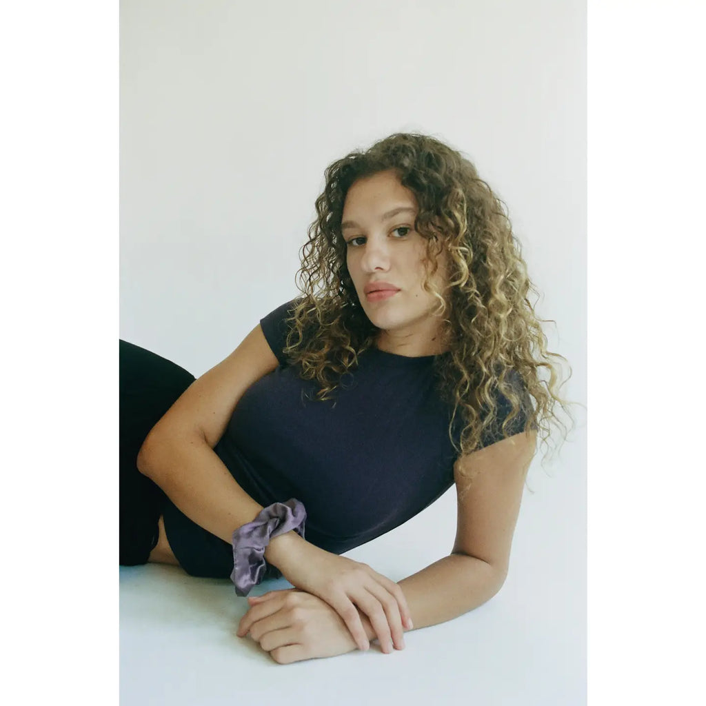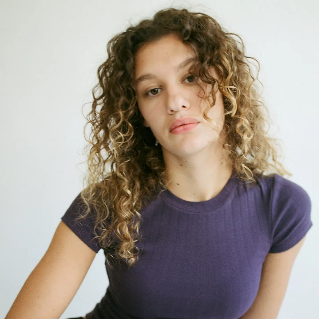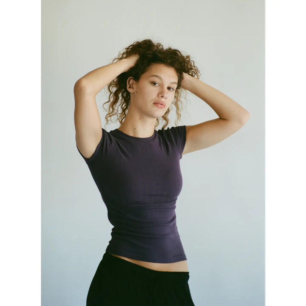 A slim cut basic crew neck tee with a textured twist. Made of an organic rib knit with a subtle jacquard pattern. Features cap sleeves and hits at the waist.