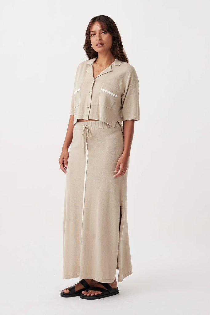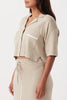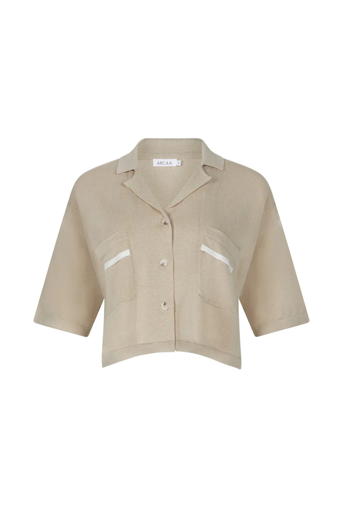The Quinn Cropped Shirt in Taupe & Cream features a slouchy cropped fit with a button front and front pockets with contrast stripe detail. Made from a lightweight blend of 45% organic cotton and 55% linen, this shirt is ethically produced and OEKO-TEX Standard 100 certified for sustainable, stylish wear.