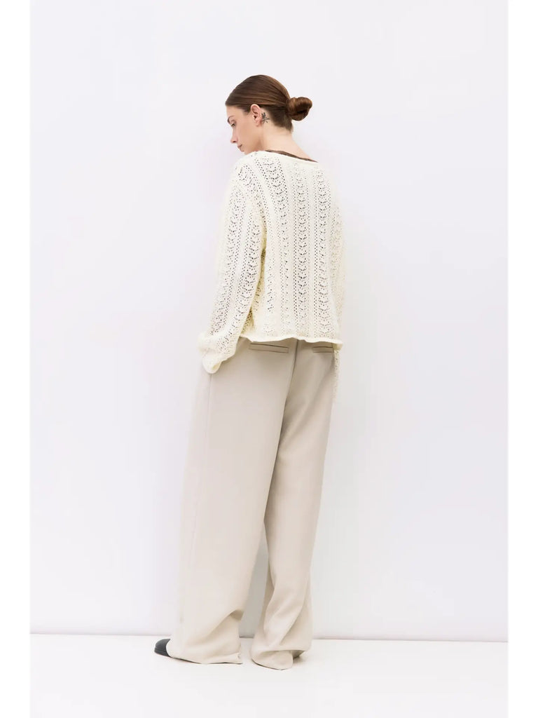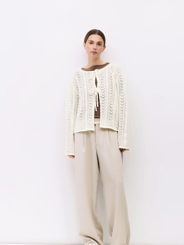 Crafted from a lightweight pointelle knit, The Avia Cardigan offers a soft, open texture and versatile style. With a crewneck, tie-front closure, and relaxed fit, it's perfect for layering in transitional weather. Stay comfortable and fashionable with this must-have piece.